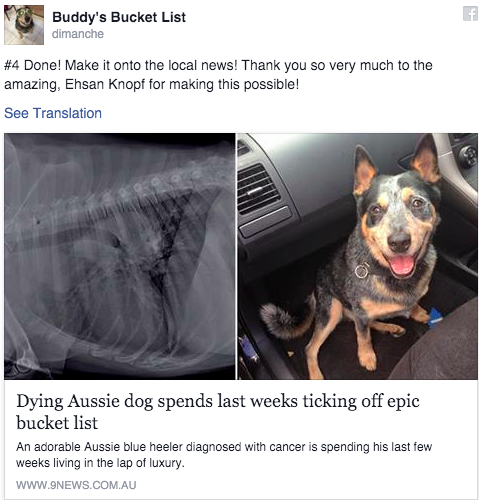 "Beaucoup de personnes ont voulu me faire des dons pour couvrir les coûts, donc j'ai mis une cagnotte en place - tous les fonds restants après sa mort seront remis à des associations pour essayer d'aider d'autres animaux dans le besoin" écrit-elle sur sa page Facebook. "Je vous remercie du fond du coeur pour votre soutien continu concernant la liste de souhaits de Buddy. Je n'arrive pas à réaliser à quel point vous avez été gentils et d'un grand soutien. Merci à tous !"